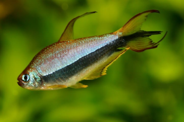 De Hockeystick (Thayeria boehlkei) is een levendige en vreedzame scholenvis met een opvallende zwarte streep, perfect voor gezelschapsaquaria met veel zwemruimte.